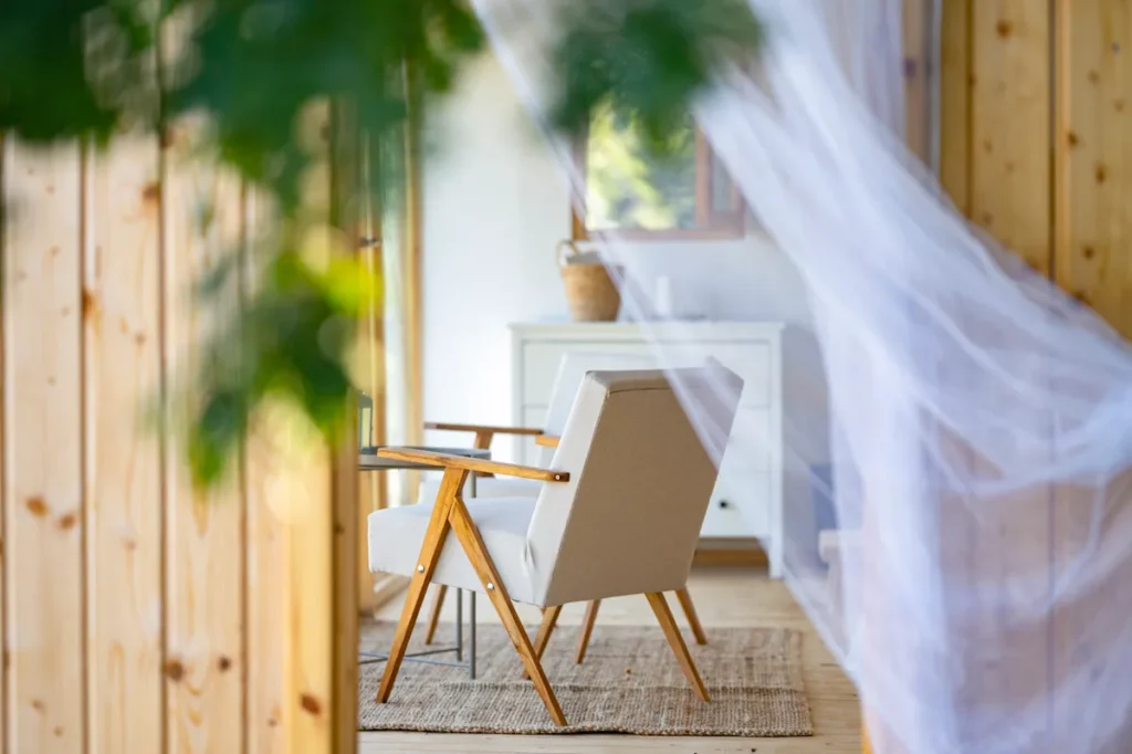 The cabin is on a hillside with an nice view. It doesn’t have electricity, it has rechargeable battery powered lamps. Inside, there is an solar-heated shower with a water tank and a compost toilet.