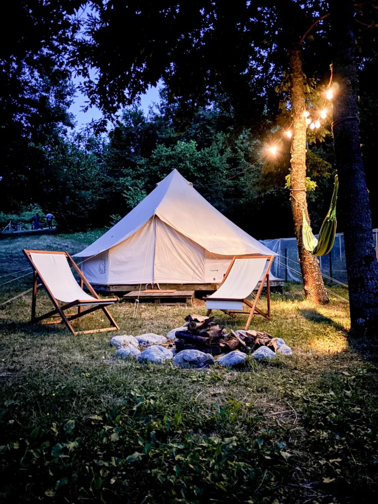 The tent is located next to the garden and has a large firepit, electricity, external compost toilet and a solar shower with running water.