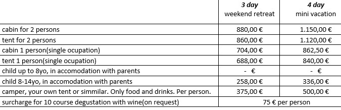 If you are arriving with your own accommodation (e.g. camper or similar) we can give you a special rate for food and drinks only. Check the pricelist for details.